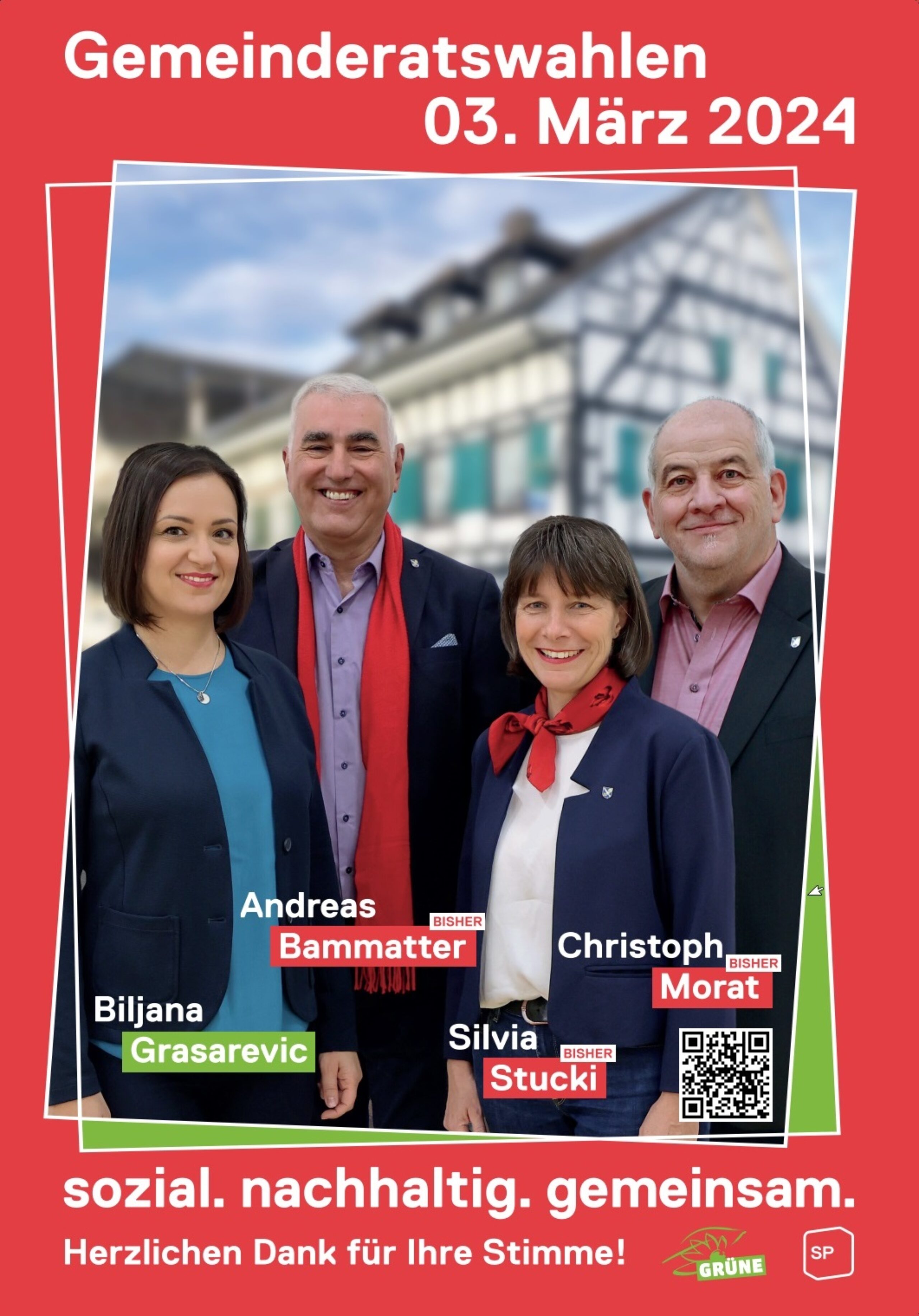 Das 4er-Team – Andreas Bammatter, Biljana Grasarevic, Christoph Morat, Silvia Stucki – wird in Allschwil „sozial. nachhaltig. gemeinsam.“ politische Schwerpunkte setzen, die Allschwil zu einem lebenswert(er)en Ort machen, an dem sich die Einwohnerinnen und Einwohner wohl und zuhause fühlen.